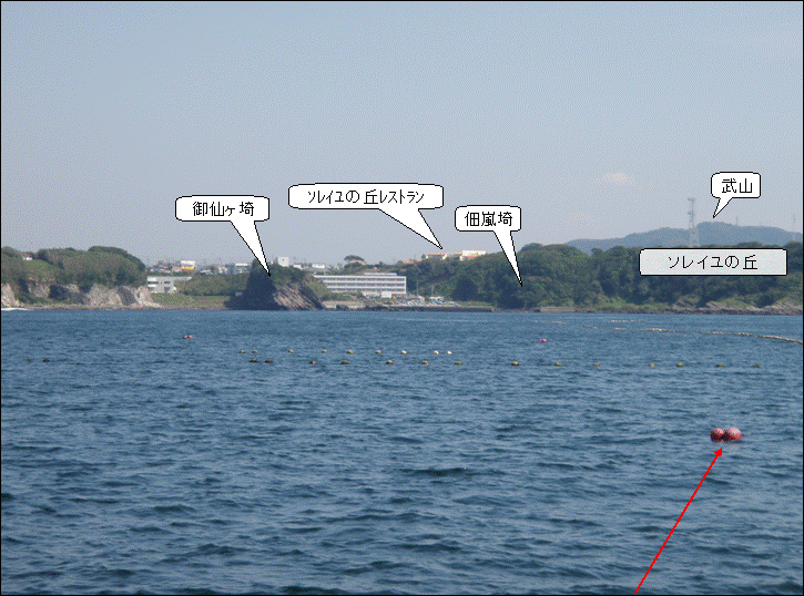 南南西側から定置網の西側(沖側)を撮影(定置網本体は見づらい) | |||||||||||