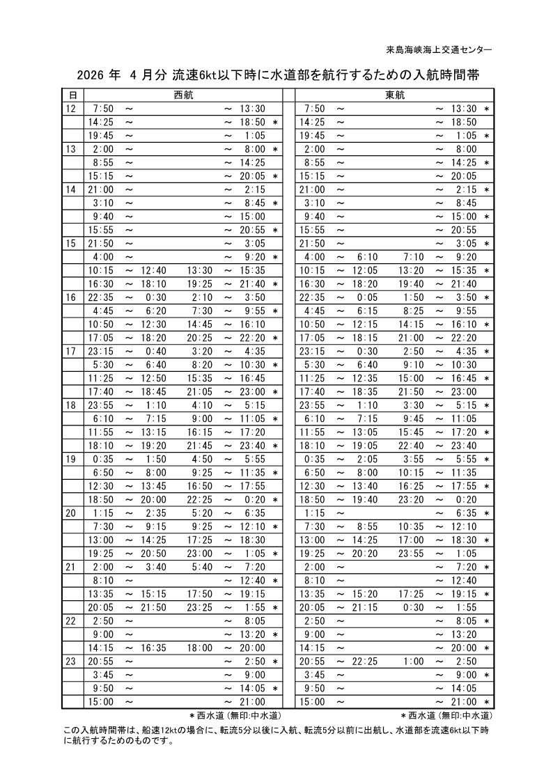 注 意: この入航時間帯は、船速12ノットの場合に転流5分以後に入航、転流5分以前に出航し水道部を流速6ノット以下時
