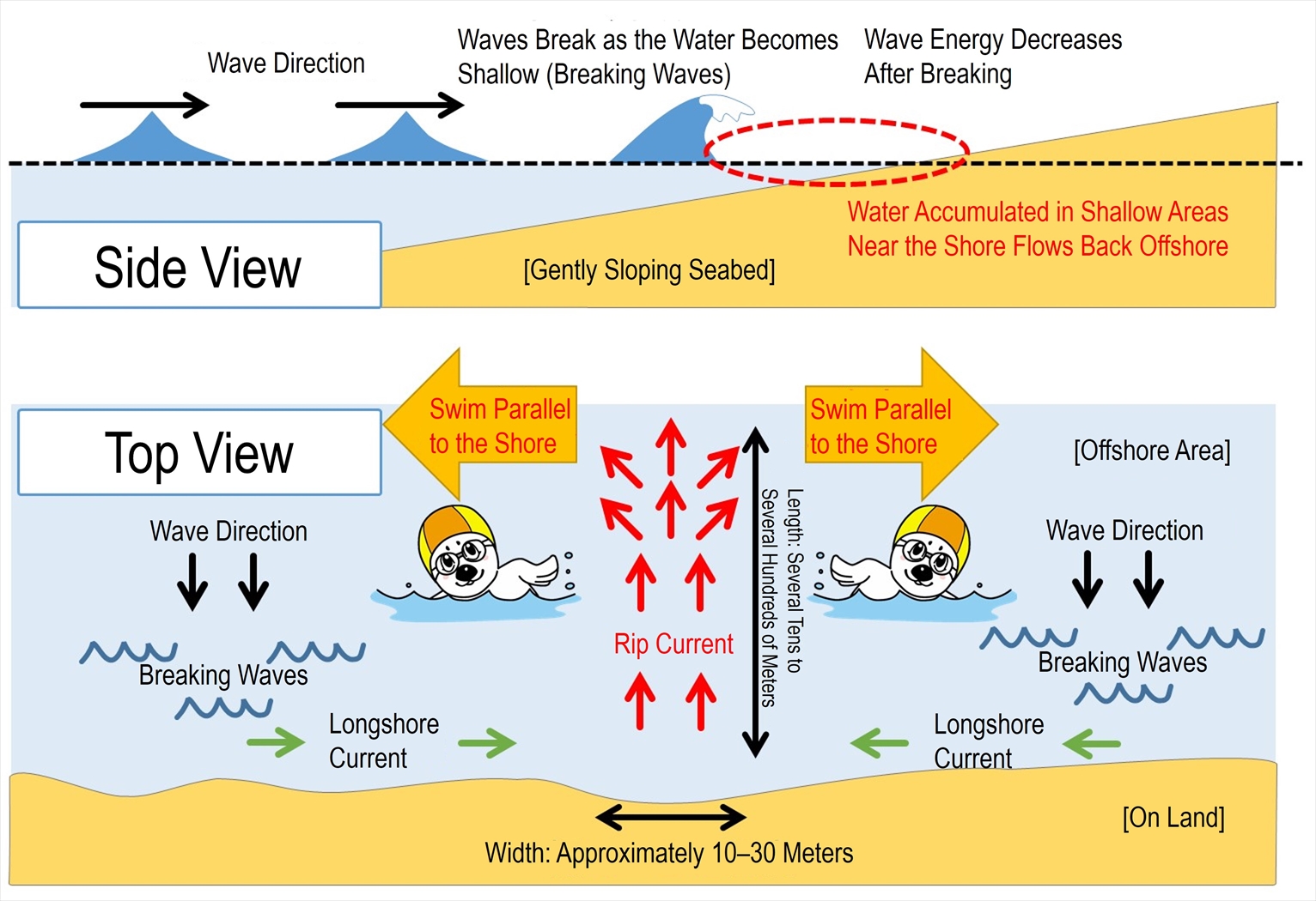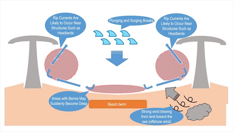 - In the sea, there may be sudden drop-offs and areas where currents become faster due to tidal changes. To avoid panic when you suddenly cannot stand or cannot return, know the shape and depth of the area where you are swimming. Waves and currents are constantly changing. Keep observing the sea conditions around you.