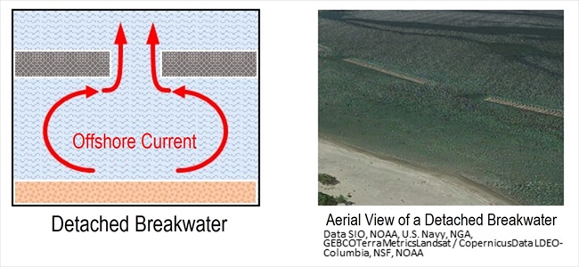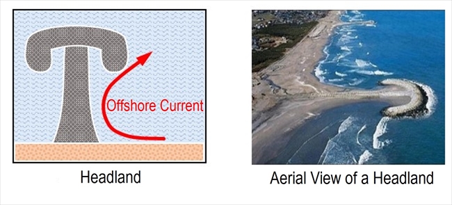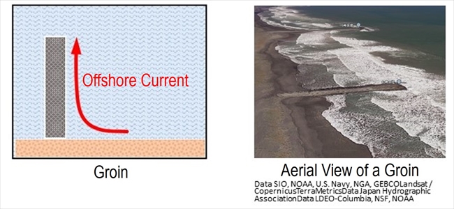 Around groynes and headlands, which are artificial structures built to prevent sand loss, rip currents and other complex flows are likely to form. Do not swim near these structures.