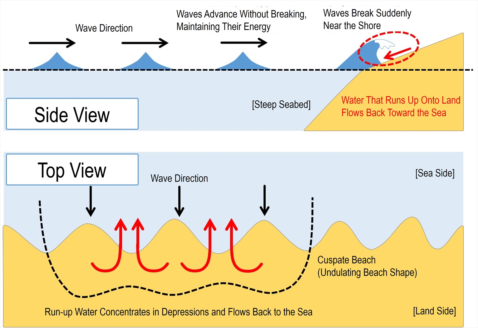 - On shorelines with irregular shapes called cuspate beaches, strong backwash currents can form as waves that have run up the beach return to the sea. When the waves are high, stay away from the water’s edge.