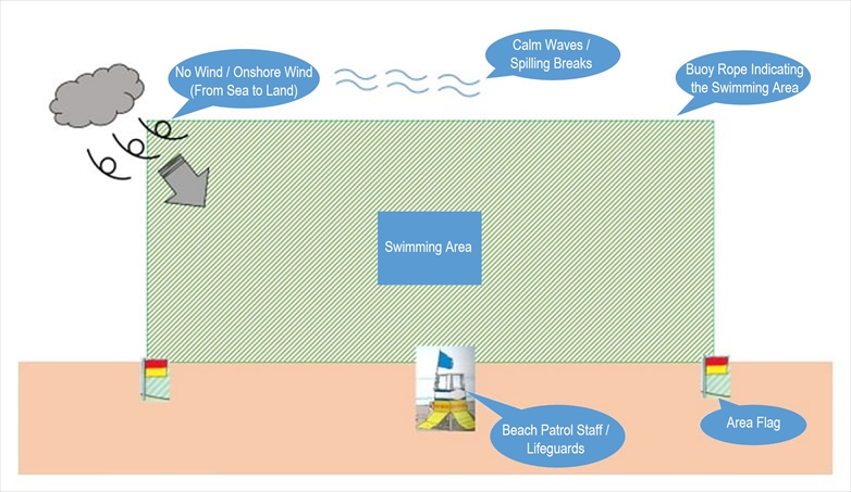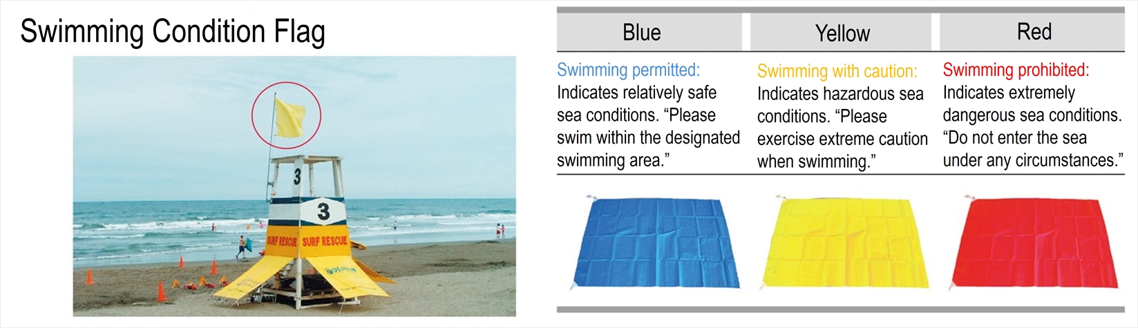 - Even at managed beaches, do not enter the water if swimming is prohibited due to bad weather or other reasons.Follow the instructions of the beach management and the colored flags (blue, yellow, red) indicating swimming conditions on that day.