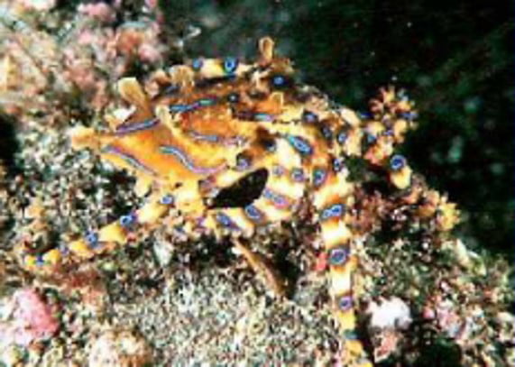 - Rocky areas and coral reefs: blue-ringed octopus, long-spined sea urchins, lionfish, moray eels, sea anemones, crown-of-thorns starfish, trumpet sea urchins, cone snails including Conus geographus, and corals.