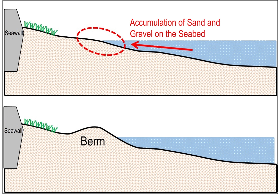 Wave action can form low ridges of sand along the shoreline, called berms.