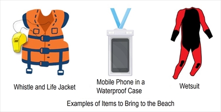 - When you go to the beach, bring a lifejacket or other buoyant aid, a whistle, and a mobile phone in a waterproof case to secure a means of communication.*