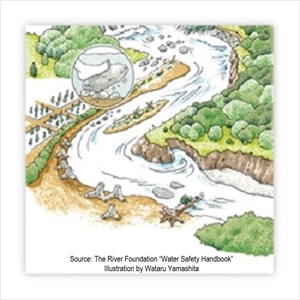 ●Natural rivers vary from upstream to downstream, and each river has its own characteristics. Deep sections and fast currents are common. Even with water only up to your knees, a strong current can sweep away an adult.