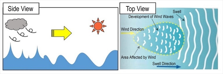 - Sea waves are broadly divided into two types: “wind waves,” generated by local winds, and “swell,” which are waves that have traveled from distant weather systems or remain after the wind has weakened or changed direction. Together, these are referred to as the sea state.