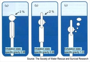 The upper body is lighter due to the lungs, while the lower body is heavier due to muscle mass. As a result, even if you try to float horizontally with your body straight, your legs tend to sink.After a while, the body tends to tilt vertical. In state (a), when you have inhaled, about 98% of your body is underwater and only about 2% is above the surface.