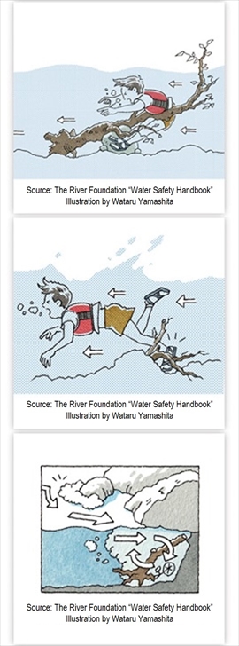 ●Wearing a lifejacket does not prevent 100% of water accidents. The strong forces in flowing water can sometimes exceed the lifejacket’s buoyancy, leading to dangerous situations where you may be trapped underwater.